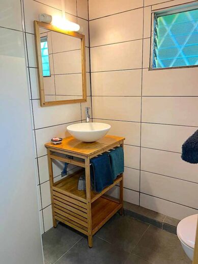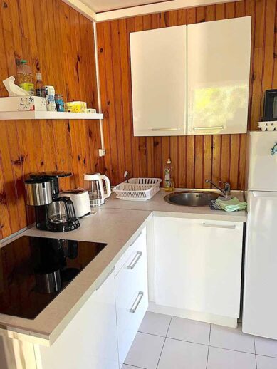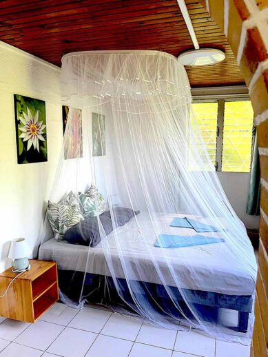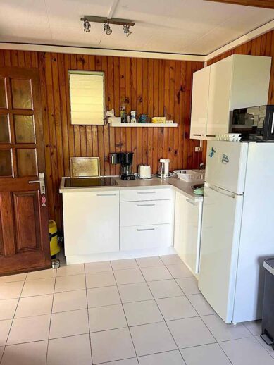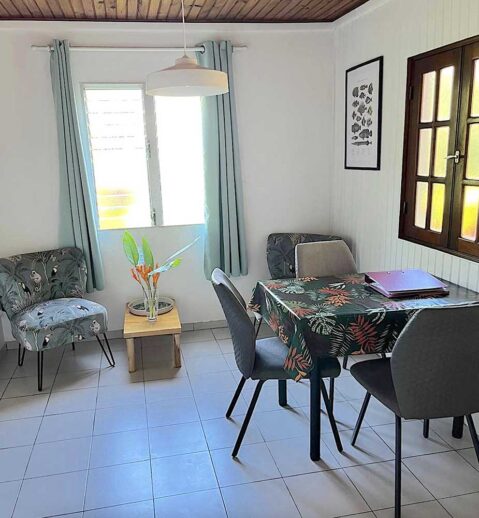 Unsere charmante kleine Ferienwohnung für 1 bis 2 Personen liegt ruhig in den Bergen von Le Vauclin an der Atlantikseite von Martinique. Die Wohnung verfügt über eine voll ausgestattete Wohnküche mit Kühl-/Gefrierschrank, Elektroherd, Mikrowelle, Kaffeemaschine und Toaster. Ein Schlafzimmer mit einem Doppelbett (160 x 200 cm), ausgestattet mit einem Moskitonetz und einem Ventilator, sowie ein helles italienisches Duschbad stehen Ihnen zur Verfügung.