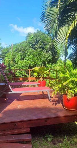 Eine eigene Holzterrasse mit 2 Liegen lädt zum Sonnenbaden unter Palmen ein.